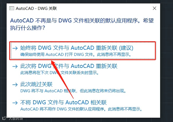 20.若出现下图所示的界面,直接点击【始终将DWG文件与AutoCAD重新关联】,没有则忽略。