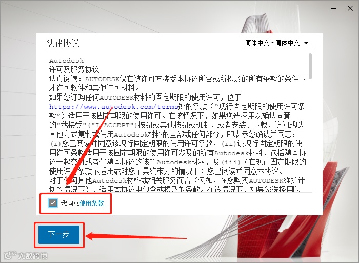 7.勾选【我同意使用条款】,然后点击【下一步】。