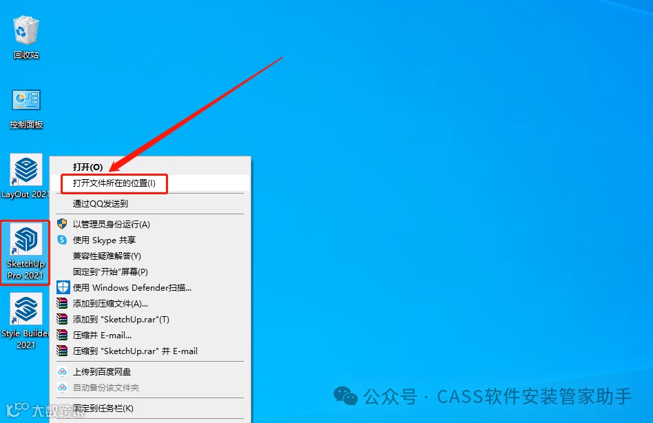 13.在桌面上找到SketchUp 2021软件图标,然后鼠标右击选择【打开文件所在的位置】。