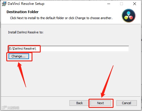 9.点击【Change】可设置达芬奇15软件的安装路径,可自行设置,教程中是安装在E盘新建的文件夹中(安装路径不要出现中文),设置好安装路径后点击【Next】。