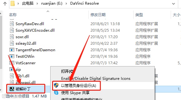 18.在文件夹中找到【破解补丁】文件,鼠标右击选择【以管理员身份运行】。