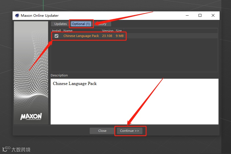 24.点击【Optional】,勾选【Chinese ···】,最后点击【Continue】。