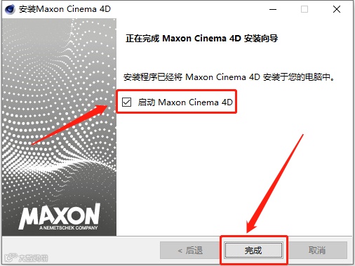 10.安装进度走完后勾选【启动Maxon Cinema 4D】,然后点击【完成】。