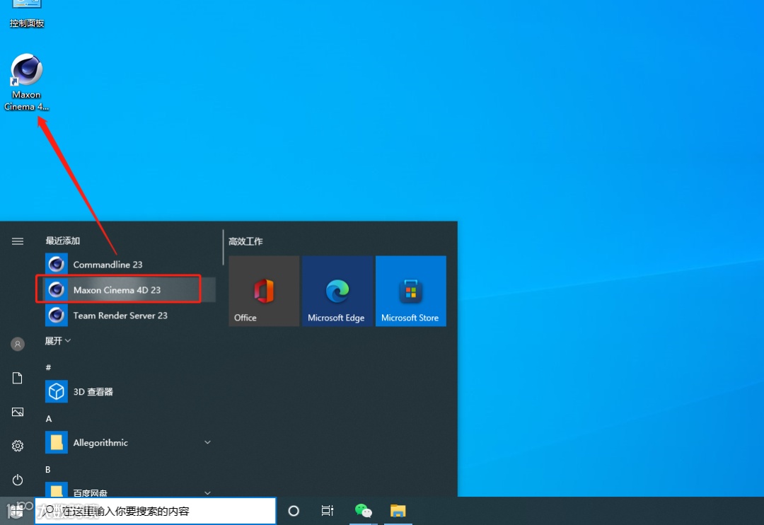 12.在开始菜单中找到【Cinema 4D R23】软件,鼠标拖拽到桌面上即可创建桌面启动快捷方式。