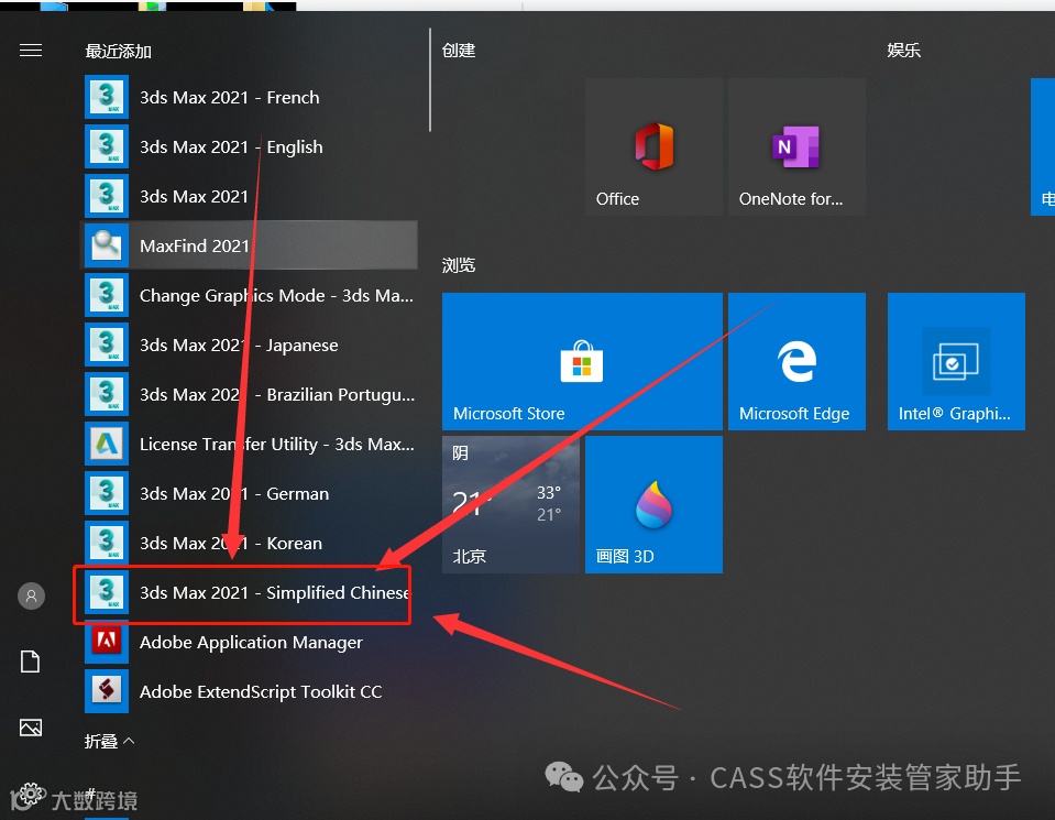 14.打开桌面左下角的开始菜单,【3ds Max 2021 - Simplified Chinese】即为软件的中文版。