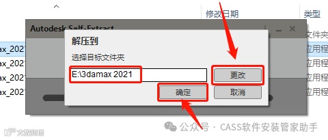 5.点击【更改】设置软件的解压路径,建议解压到除C盘以外的磁盘,我这里选择解压到E盘,并在E盘中创建了一个名为3dmax 2021的文件夹,设置好解压路径后点击【确定】。