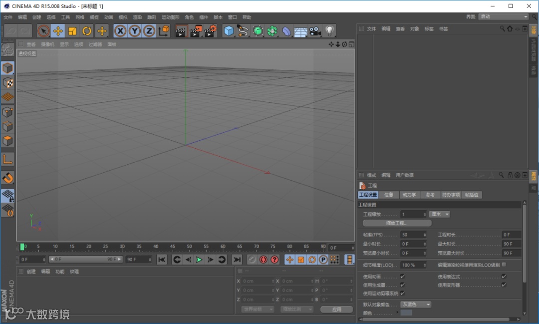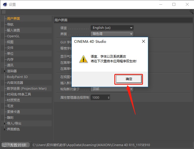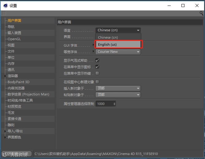31.Cinema 4D R15软件中英文切换:软件默认语言为中文,如需英文版,则打开C4D软件,然后按快捷键【CTRL+E】,弹出设置界面,在【Language】中选择【English】。