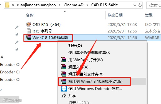 1.下载【inema4D R15】软件安装包,鼠标【win7 8 10虚拟驱动】压缩包,选择【解压到win7 8 10虚拟驱动】。