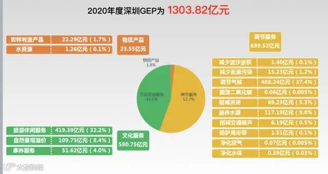 “绿水青山”值多少“金山银山”?10月22日,《深圳市2020年度生态系统生产总值(GEP)核算报告》(以下简称《报告》)正式发布。根据《报告》,深圳市2020年度GEP为1303.82亿元。其中物质产品价值23.55亿元,调节服务价值699.52亿元,文化旅游服务价值580.75亿元,占比分别为1.8%,53.7%和44.5%。