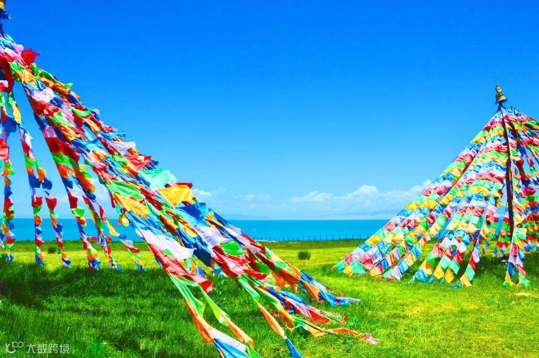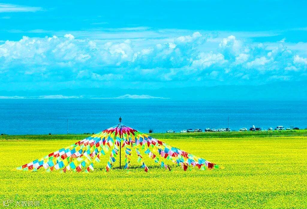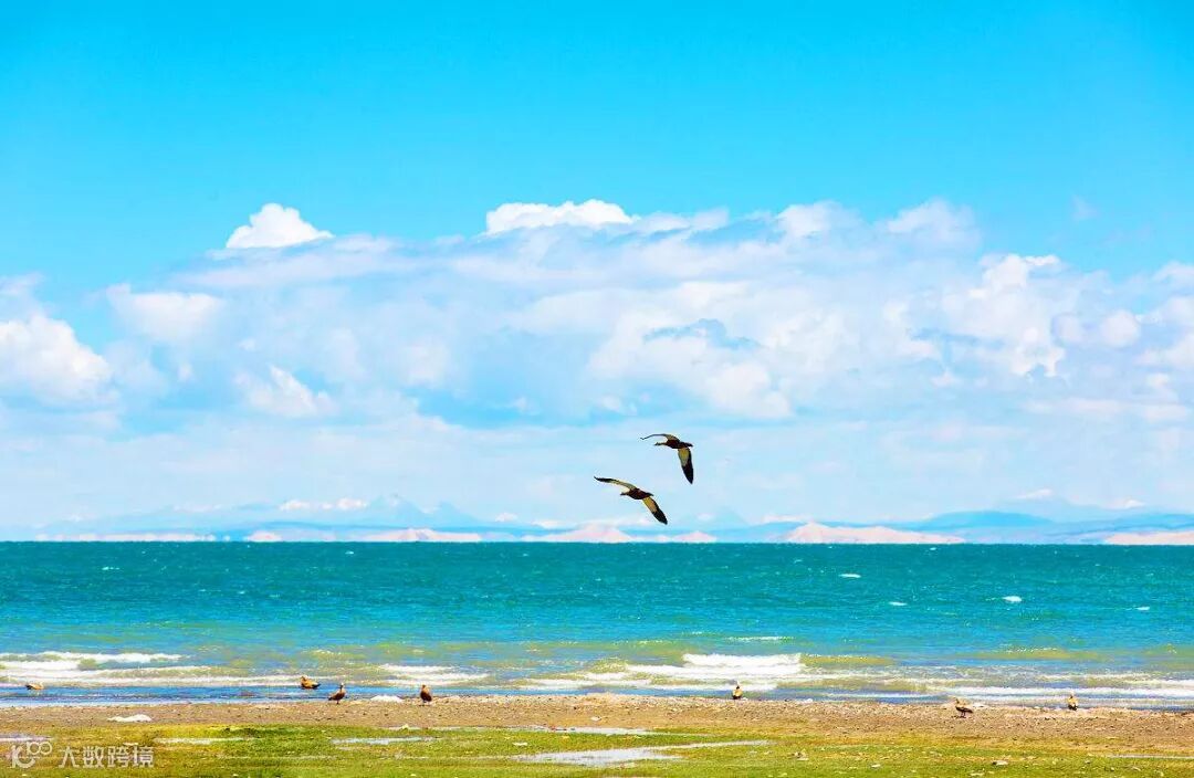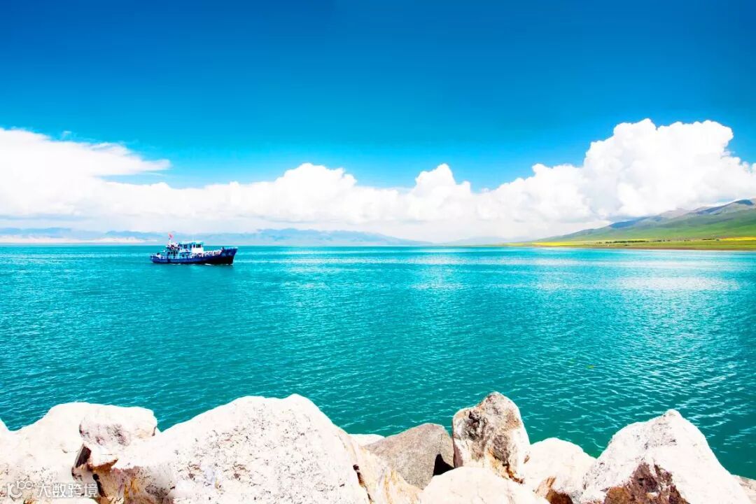 碧波万顷,水天一色,雪山连绵,绿茵如毯,羊群似白云飘动,使人陶醉于诗情画意般的景色中。