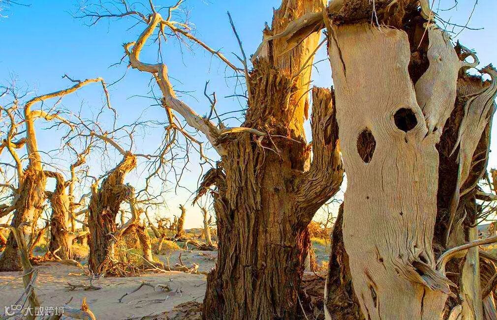 这里是一大片死去的胡杨林。胡杨千姿百态的造型在这里体现得淋漓尽致,有的直刺蓝天,有的弯曲盘旋,还有的轰然倒下。
