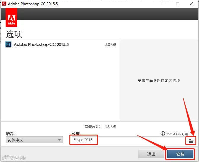 7.点击右下角灰色的小文件夹图标即可更改ps cc2015的安装路径,设置好安装路径后点击【安装】。