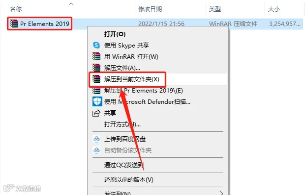 1.下载【Pr Elements 2019】软件安装包,鼠标右击压缩包选择【解压到当前文件夹】。