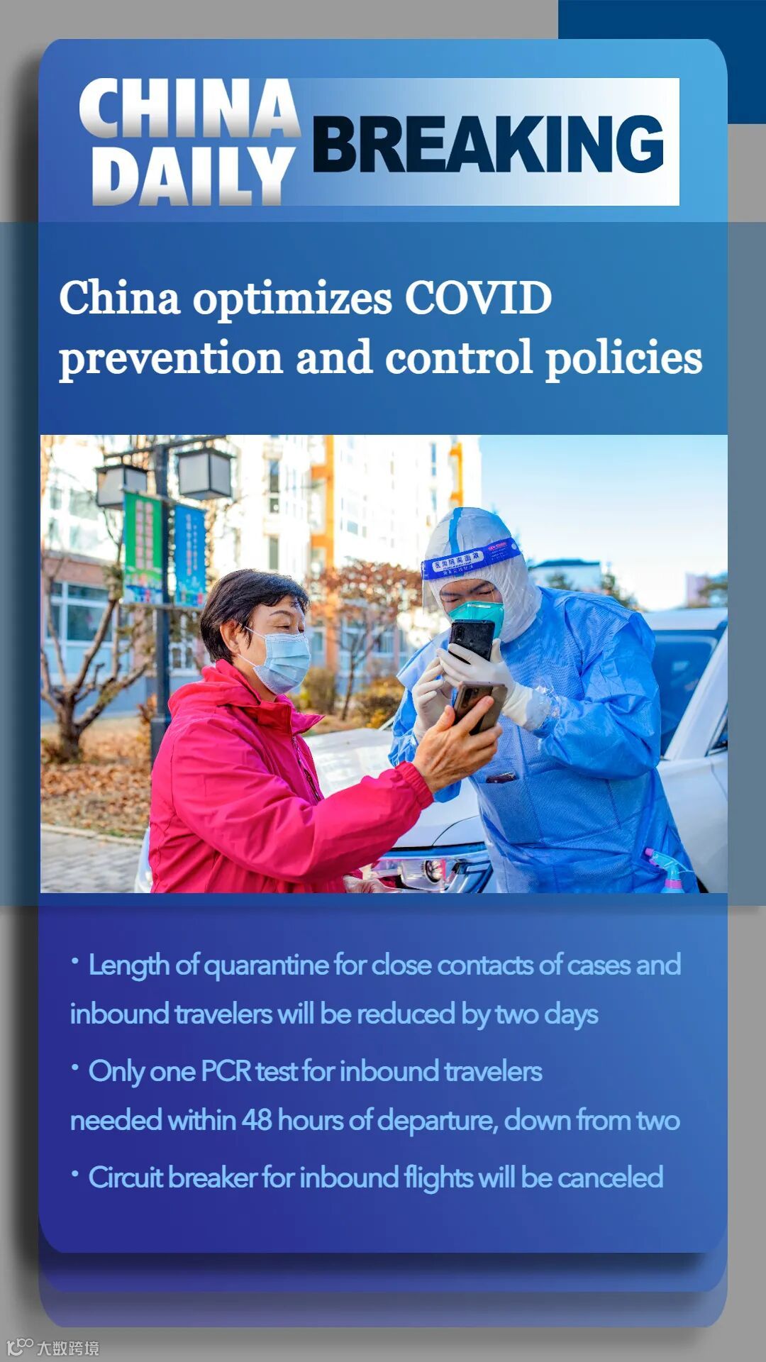According to the notice released by the State Council's Joint Prevention and Control Mechanism, international travelers will undergo five days of centralized quarantine plus three days of home-based isolation, compared with the current rule of seven days of centralized isolation plus three days spent at home.