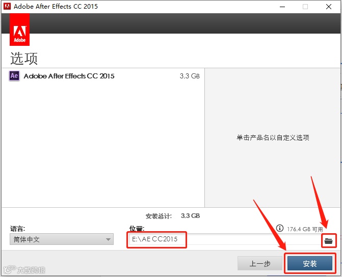12.点击右下角小文件夹图标即可更改AE CC2015的安装路径,用户可自行设置,设置好安装路径后点击【安装】。