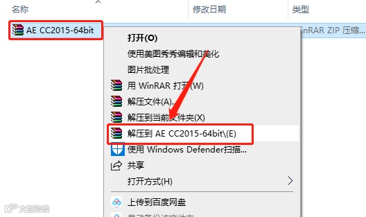 1.下载【AE CC2015】软件安装包,鼠标右击压缩包选择【解压到AE CC2015-64bit】。