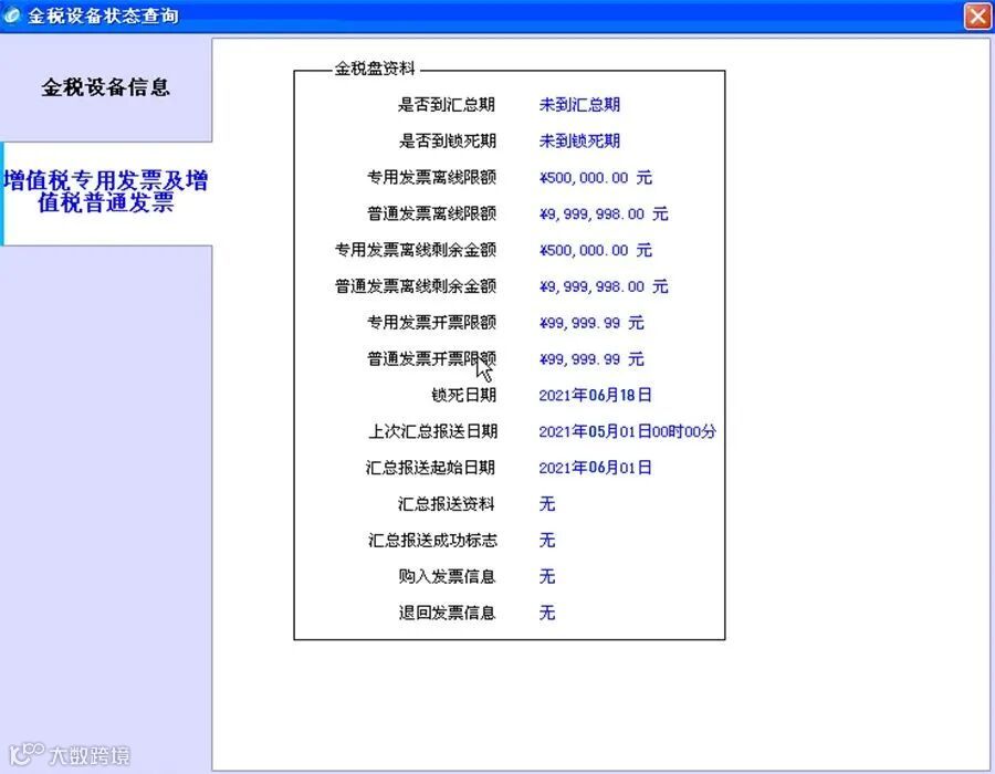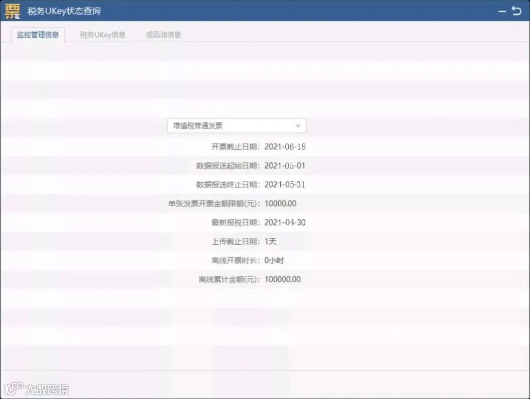 系统设置-税务UKey设置-税务UKey状态信息,弹出“税务UKey状态查询”窗口,系统默认显示在监控管理信息选项卡,查看各发票种类“开票截止