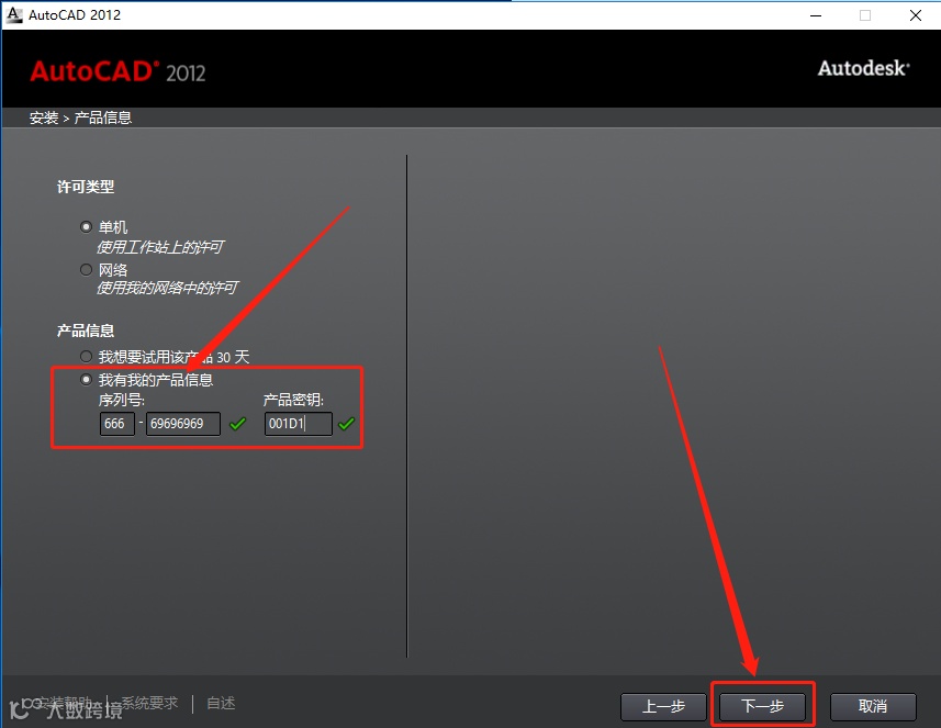 8.输入序列号:666-69696969,密钥:001D1,输入好后点击【下一步】。
