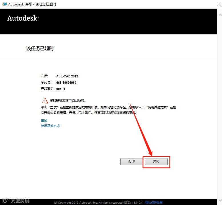 15.如果出现下图所示的任务超时,或者激活失败的提示,直接点击【关闭】即可。