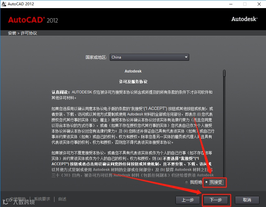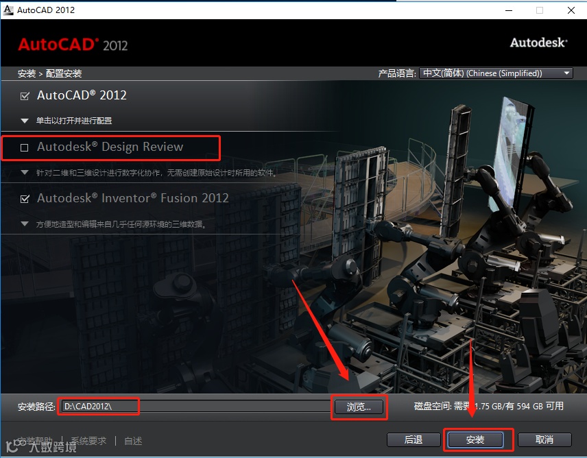 (注意:这里第二项Autodesk@ Design Review可以选择安装,也可以不选,建议不要选择,否则有可能导致最后安装失败。)