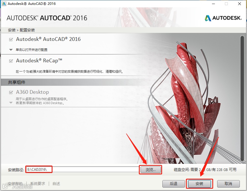 9.点击【浏览】设置CAD软件安装路径,建议安装到除C盘以外的磁盘,可自行设置,设置好安装路径后点击【安装】。