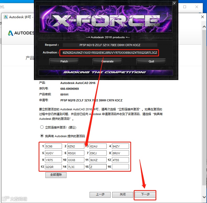25.全部选中Activeation中生成的激活码(仔细检查是否复制完整),使用快捷键Ctrl+C或者鼠标右击复制生成的激活码,然后使用快捷键Ctrl+V粘贴激活码至激活码方框中,最后点击【下一步】。