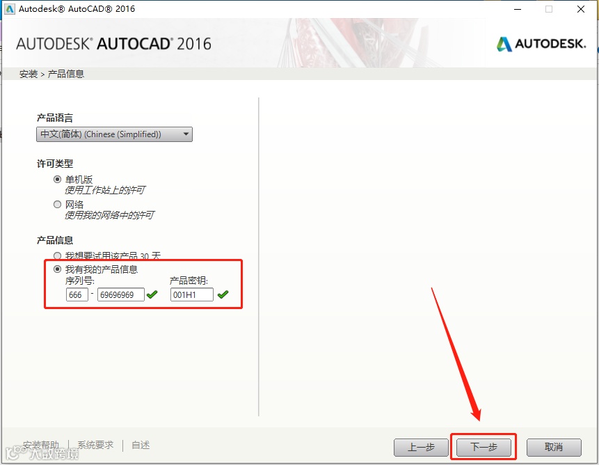 8.输入序列号:666-69696969,密钥:001H1,输入好后点击【下一步】。