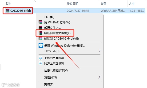 1.下载CAD安装包,然后鼠标右击压缩包,选择【解压到当前文件夹】。