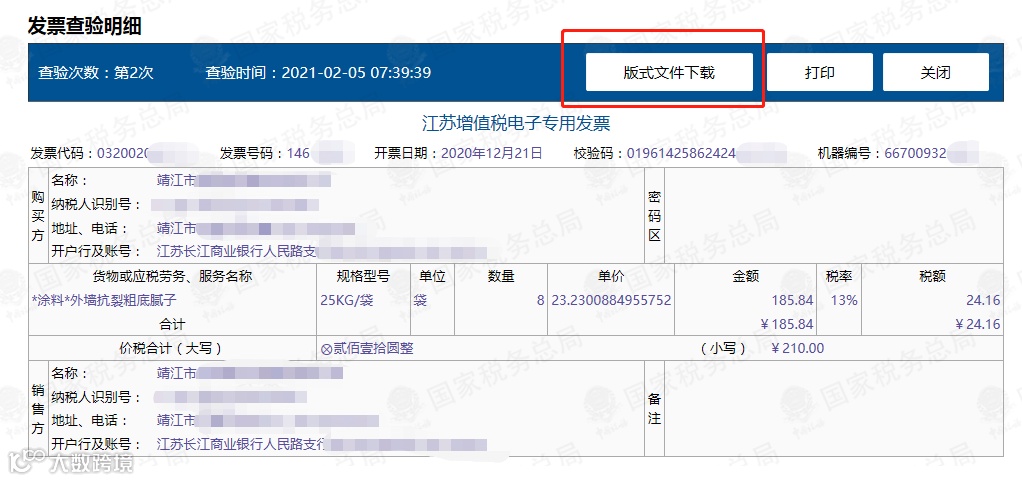 全国增值税发票查验平台中提供版式文件下载功能,在发票查验明细中,点击“版式文件下载”按钮,可预览或下载电子专票版式文件。也可链接受票方预留的邮箱,购方纳税人可查看或下载版式文件。