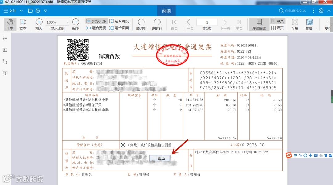 第二步,在阅读器里进行“打开”操作,选择已经下载好的增值税电子普通发票版式文件;也可以直接鼠标双击已下载好的增值税电子普通发票版式文件打开。将鼠标移至增值税电子普通发票“发票监制章”区域内,点击鼠标右键,选择“验证”功能,如下图所示。