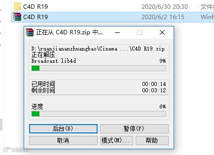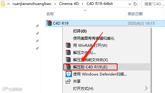 1.下载【Cinema4D R19】软件安装包,鼠标【C4D R19】压缩包,选择【解压到C4D R19】。