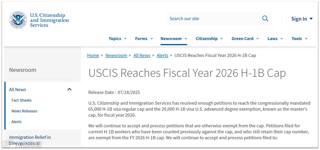 美国移民局(USCIS)正式宣布:截至2024年6月30日,2026财年所有基于抽签中签的H-1B申请名额已被用尽。这意味着,今年将不再进行第二轮H-1B抽签。
