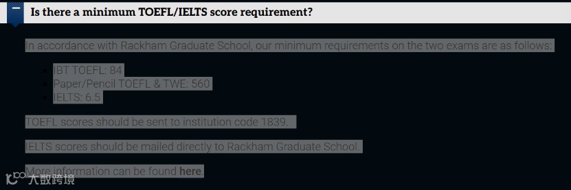 大部分项目的最低要求是TOEFL 84;IELTS 6.5,但是仅仅达到最低要求是远远不够录取的,推荐分数: