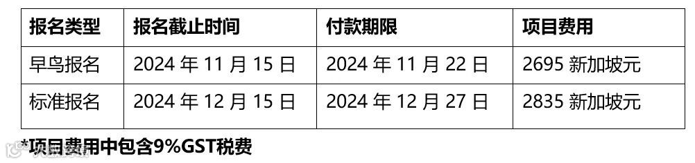 酒店可选双人间:新币 760 元(与其他参与者同房)或单人间:新币1,340 元。