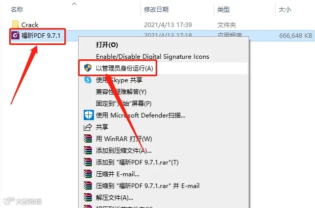 3.鼠标右击【福昕PDF 9.7.1】程序,选择【以管理员身份运行】。