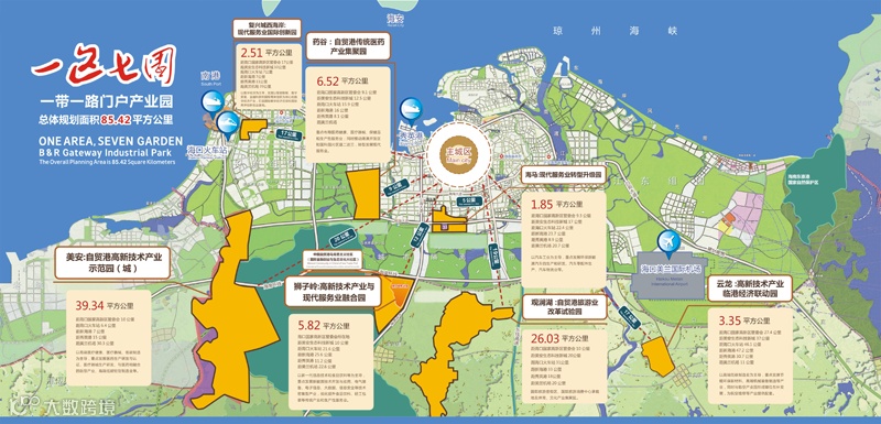 The hi-tech zone is composed of five professional sub-parks: Mei'an Ecological Science and Technology New Park, the main area of Haikou National Hi-tech Zone, focuses on creating an ecological science and technology park that integrates industrial development, technological innovation, commerce and logistics, and other functions, dedicating to build up Hi-tech industrial clusters led by sensors and information technology, new energy and new materials.