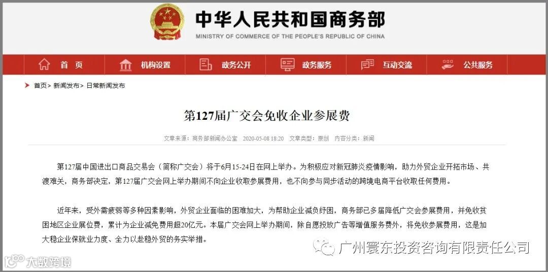 为积极应对新冠肺炎疫情影响,助力外贸企业开拓市场、共渡难关,商务部决定,第127届广交会网上举办期间不向企业收取参展费用,也不向参与同步活动的跨境电商平台收取任何费用。