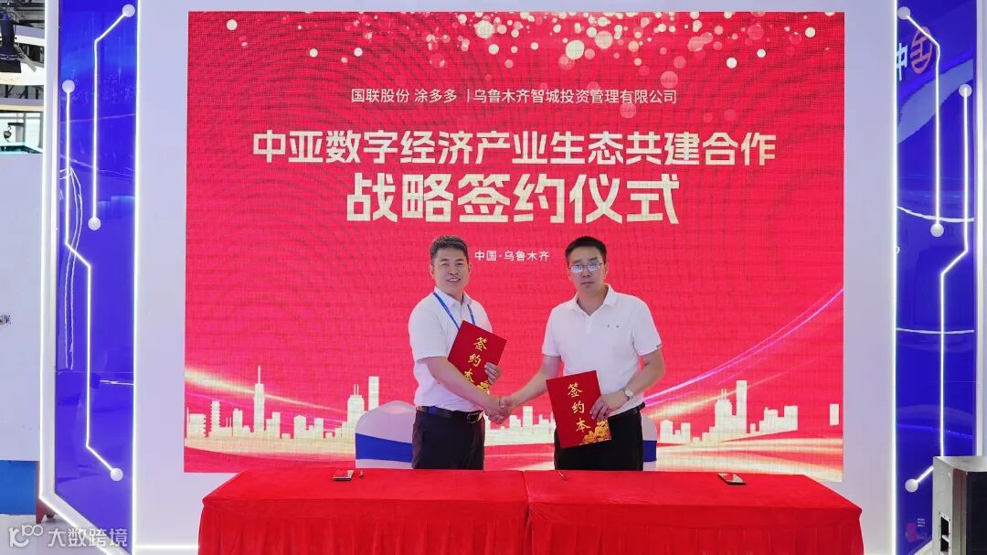 涂多多高级副总裁、运营部总监邵召军与乌鲁木齐智城投资管理有限公司投资基金负责人李辉共同签署中亚数字经济产业生态共建合作项目。