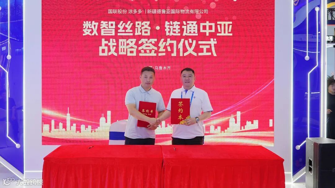 涂多多高级副总裁、智运总经理安珅新疆德鲁亚国际物流有限公司副总经理朱振东共同签订数智丝路•链通中亚项目。