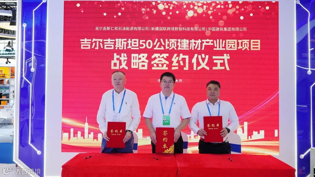 新疆国联跨境数智科技有限公司总经理邵春生与吉尔吉斯仁和石油能源有限公司 董事长张华,中国建筑集团有限公司中亚总经理蔡云辉共同签署吉尔吉斯坦50公顷建材产业园项目。