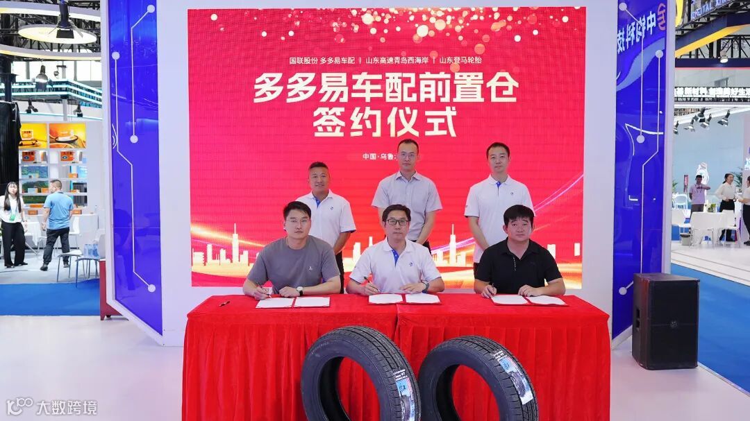 CNAUTO CEO 张伟,国联股份跨境技术中心总经理魏立峰,多多易车配总经理杨瑾与山东高速青岛西海岸港口有限公司董事长李明亮,山东登马轮胎总经理陈春良,山东高速青岛西海岸港口有限公司总经理助理石东生共同签订山东高速多多易车配前置仓项目。