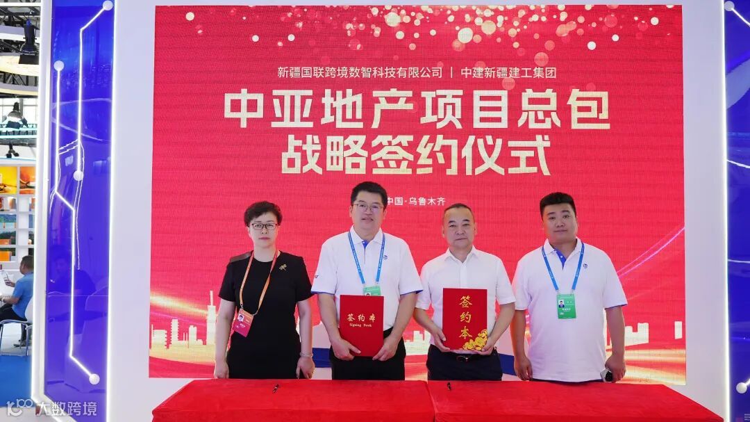 国联股份高级副总裁、涂多多CEO刘斋,新疆国联跨境数智科技有限公司总经理邵春生,国联股份新疆总经理、涂多多副总裁李庆与中建新疆建工集团副总经理苏子卿共同签订中亚地产项目总包。