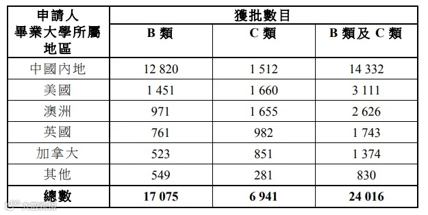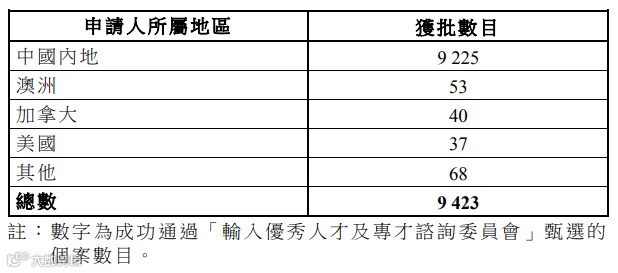 以上数据包含了“综合计分制”和“成就计分制”。优才的获批数据是以成功通过“输入优秀人才及专才咨询委员会”甄选的数据为准。可以看出,超过97%以上申请人来自于中国内地。