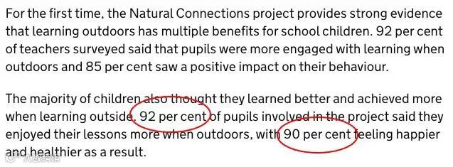 《自然英格兰》杂志对英格兰南部125所学校的学生,进行了一项为期四年的研究,发现92%的学生更喜欢在户外上课,90%的学生因此感到更快乐、更健康。