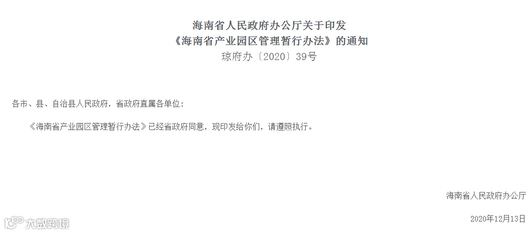 2020年12月13日海南省人民政府办公厅发布了《海南省产业园区管理暂行办法》的通知,小编为您选取了其中和企业注册及人才落户相关的部分,可多加关注。