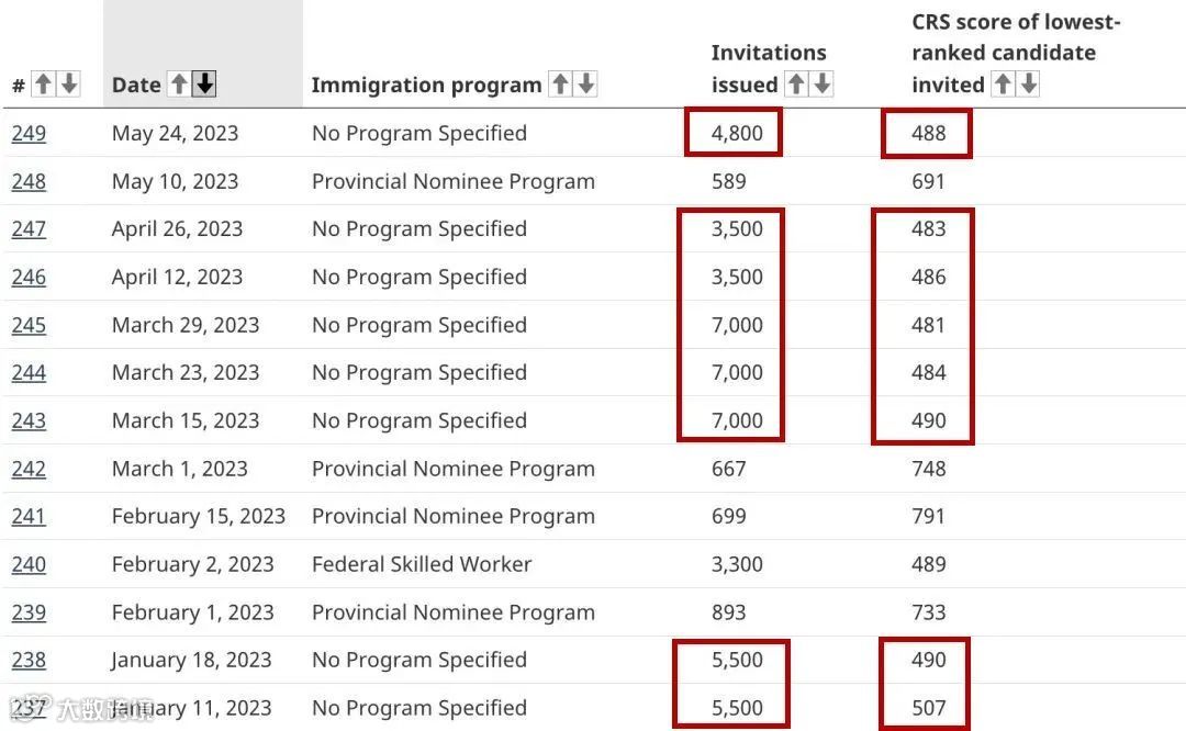 本轮向快速通道候选人发出了4,800份邀请,这也是自4月26日以来的首次全类别抽签!抽选分数488分,分数比上次上涨了5分,不区分抽选类别。