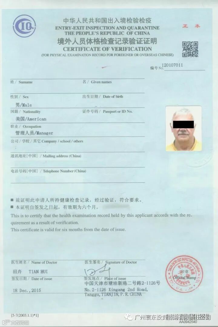 (由中国检验检疫机构出具的境外人员体格检查记录验证证明或健康检查证明书,或经中国检验检疫机构认可的境外卫生医疗机构出具的体检证明,签发时间均在6个月内。)