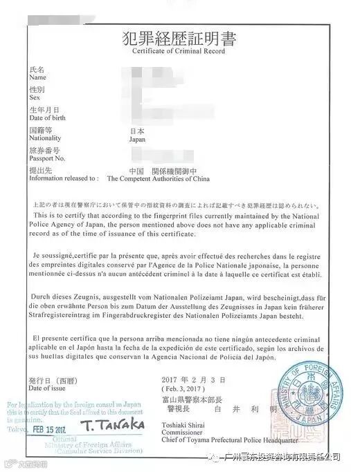 (应当由申请人国籍国或经常居住地警察、安全、法院等部门出具并经我驻外使、领馆认证或外国驻华使、领馆认证。在港澳特别行政区和台湾地区出具的无犯罪记录证明,应经所在地区公证机关公证。