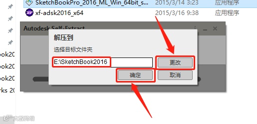 5.点击【更改】设置软件的解压路径,可以在者其它盘新建一个【SketchBook2016】文件夹,然后点击【确定】。解压路径下的【文件夹名称】不能有中文。