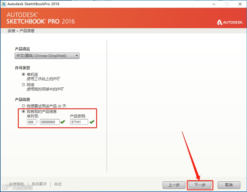 9.输入序列号:【666-69696969】,密钥:【871H1】,后点击【下一步】。